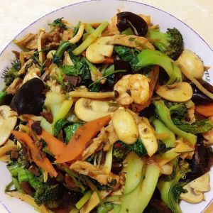 依次放入煸炒过的肉、虾、菌类、最后放入青菜翻炒,加盐,