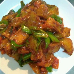 另起锅放底油,下豆瓣番茄酱蒜末出颜色,下青椒块西红柿块炒匀加水,调味,倒入炸好的茄子,翻炒均匀淋明油出锅。