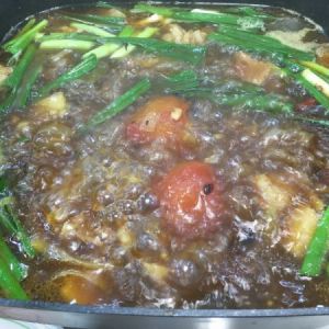 牛腩汤煨好后倒入火锅容器里,加入胡椒粉和切好的蒜苗段,就可以啦。