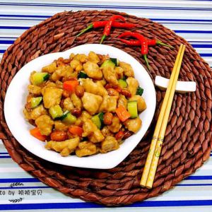 煨制入味的鸡肉丁倒入热油中快速翻炒炒至鸡肉变色即可盛出
