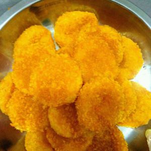 用手把面团揪成小疙瘩,揉成饼状,两面粘满面包糠放置一旁。