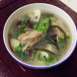 将排骨洗净,冷水下锅,放入两片姜,煮开去血水~莲藕、香菇、海带和香菜洗净切块备用~