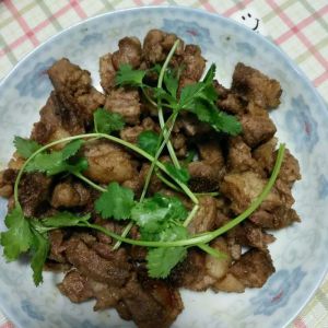 肉的水份煎没有一面有点焦黄后放入盐和孜然粉,翻面煎另外一面,煎好出锅放上香菜就可以了