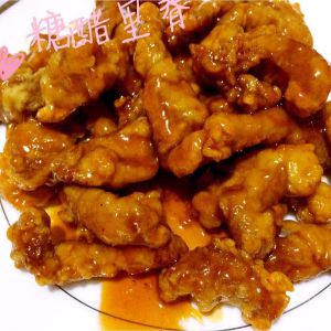 然后刷锅,加热后放很少底油,加番茄沙司加番茄沙司三倍的白糖,加适量水熬至粘稠。水量看色泽浓轻判断。然后关火,放里脊肉快速翻炒均匀。出锅啦!