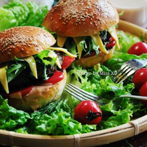 汉堡胚烤好后,切开两半。涂抹一层厚厚的沙拉酱,依次铺上黄瓜片、番茄片、猪排、苦菊叶、百吉福芝士片