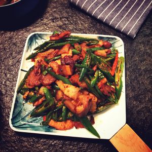 下肉片翻炒至出油,放一小块火锅底料(原来是加豆瓣酱的,可是家里没有)