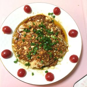 浇上调好的酱汁,撒上葱花,用四个圣女果装饰摆盘,当当当当,大功告成!