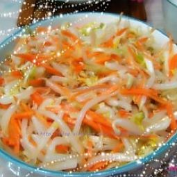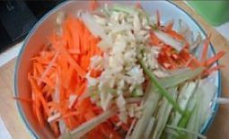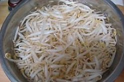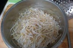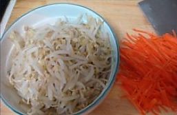 胡萝卜丝放在豆芽上,再放上葱丝、蒜末。