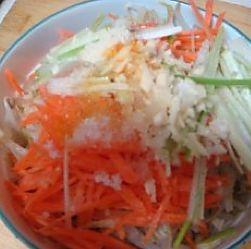 挤去多余水分放进大碗中,胡萝卜切丝。