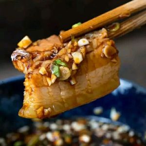 . 一整块带皮五花肉,加姜片和料酒,水滚后煮10分钟。煮完捞出过冷水,沥干晾凉,切薄片。