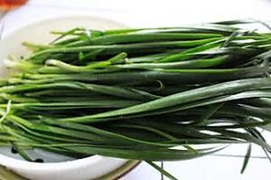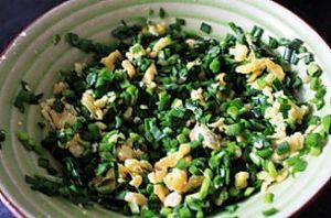 韭菜切碎,加少量油和盐,和炒好的鸡蛋搅在一起。