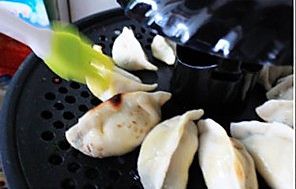 接油盘加水,放在气灶上。饺子摆在烤盘上,安上热反射灶。盖上盖子开烤。开始的火有点急了,锅贴的边有糊点了,我把火拧小,然后用刷子蘸油刷到锅贴上。