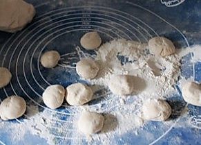 冷水和一块软面,醒十五分钟,然后揪成大小相等的剂子。擀成均匀的饺子皮。