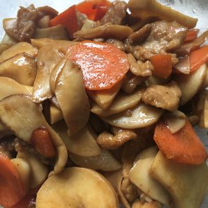 加入切好的平菇,胡萝卜,蒜头。翻炒。使平菇都有过油。
