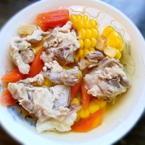 把玉米水果胡萝卜放汤碗底部然后再放生姜,排骨