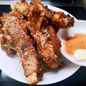 装盘,配上一点椒盐和蒜瓣,一盘香喷喷的新疆风味的烤羊排就做好了。