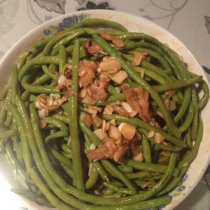 先把葱姜花椒用油爆香放入五花肉,翻炒片刻放入豆角,因为豆角是用水焯过的所以不用炒太久,最后把放有蒜沫和淀粉调好的酱汁倒入锅内收汁即可!