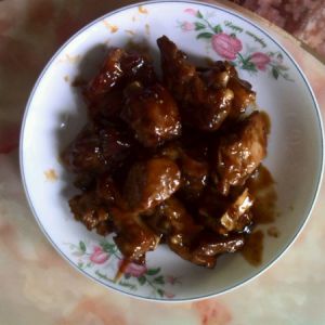 将多余的油倒掉,留底油,倒入调好的酱汁(料酒,酱油,白糖,醋,清水调制而成)。酱汁滚了之后,倒入排骨。