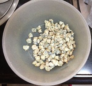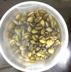 买回来的沙蛤,放入清水中浸泡半天,可在水中滴几滴食用油。