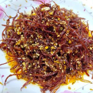 撕成小丝后,锅内热油,下八角桂皮香叶干辣椒花椒,中火!爆香后丢掉锅内香料,此时的油已经混入所有香料,准备姜丝蒜丝下锅小火爆香,然后放入牛肉丝,中火不停翻炒,待牛肉丝稍微卷起,小火,放入花椒粉粗细辣椒面白芝麻,糖,鸡精(看自己口味鸡精可以不加)翻炒1分钟,起锅,搞定,一盘灯影牛肉丝就好了!过程中不能用大火,以免烧焦!
