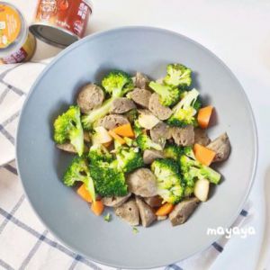 翻炒西蓝花和胡萝卜几次,再加入丸子。