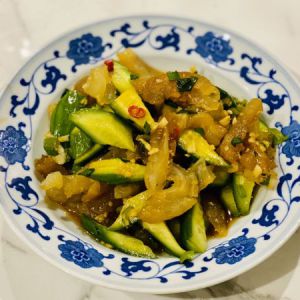 黄瓜切块,海蜇过温水放量,和准备好的料汁拌在一起腌制半小时。