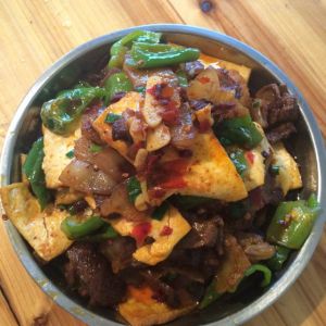 五花肉用水煮八成熟,切片,豆腐也切片待用。青椒斜切,生姜,蒜头切片。