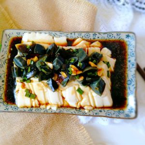 切碎的皮蛋放在豆腐上,倒入调好的料汁