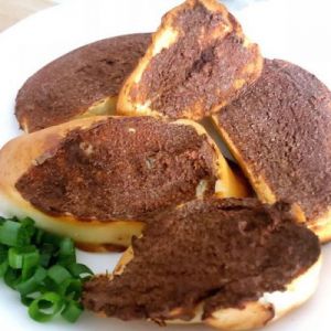 馒头切片,将虾酱涂抹均匀。我这个虾酱有点咸,我就抹的一层~