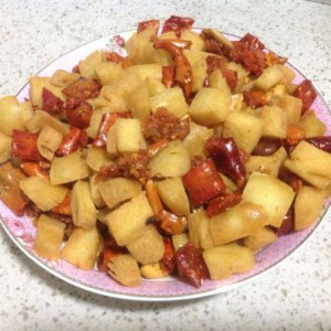 把多余的油倒出,用炸馒头的油锅(不用有油)把馒头块,咸鱼块和香酥辣椒翻拌均匀就可以装盘了