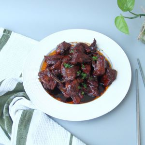 小火慢炖到汤汁变很少,期间要开锅盖翻炒3-4次,炖煮更均匀入味。然后再加入糖炒匀提鲜,此时可以试下味道和排骨的软烂程度,再决定是否要再继续炖一会。如果排骨已经软烂了,那就可以开大火收格汁即可,然后出锅,装盘,撒上葱花装饰即可!