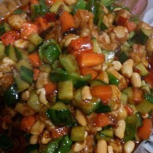 锅里放油加热在放入花椒和干辣椒(切段)煸香后捞出,在放入豆瓣酱煸香后在放入提前搅拌后的料抄香后在把鸡丁黄瓜活萝卜青椒放入锅里翻炒几下在放入果仁,翻炒后在放适量的盐,调淀粉(用水)倒入锅里勾芡出锅,上面是成品
