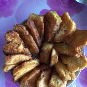 锅烧热倒油,待油开后将馒头片在鸡蛋液内滚一边,放进热油内炸至金黄出锅