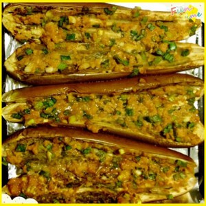 茄子洗干净,去掉头部的柄,然后竖方向切开,注意不要切断,方便涂酱料!刷上一层油(薄薄就OK),烤箱180度越热好烤16分钟。