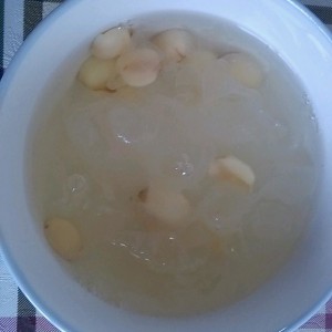 银耳,莲子依次倒入电饭锅,加入适量的水,再加入少许冰糖,按电饭锅煲汤键,自动煲汤。