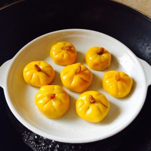 分成若干个乒乓球大小,放进馅料红蜜豆。搓圆,在顶部插粒葡萄干,用牙签压几道南瓜印迹。