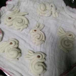用红豆做眼睛,耳朵的地方也要用牙签压出一道印。(没有红豆可以用红皮的花生!我后来就是用的花生)