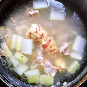 两小时左右,放入冬瓜、玉米,加盐。煮15分钟左右、加入胡椒粉即可