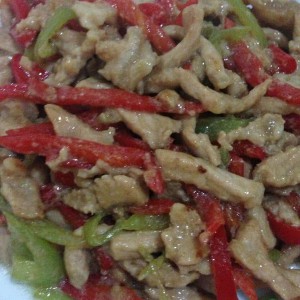 锅内放油,将青椒放入翻炒2分钟,倒入待用的肉丝,加盐一起翻炒至熟,起锅