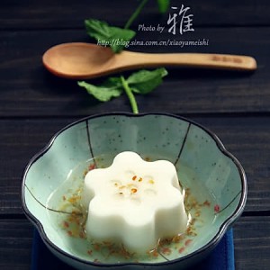 将注入杏仁豆腐液的模具放入冰箱冷藏2小时,糖桂花和冰糖用温水拌匀,与凝固好的杏仁豆腐一同食用即可。