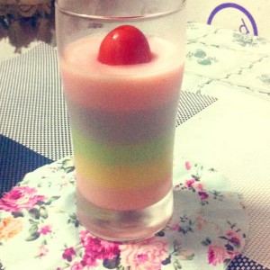 依次做好另外4种颜色。最后可在顶部加水果点缀。不塌陷即可品尝了。看我的图片,拍的还不错吧。