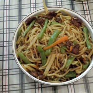 由底向上翻操菜和面,拌匀装碗。明天老公的午餐有着落了=_=。