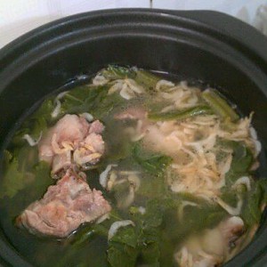 排骨、姜片放入砂锅加水大火煮开转小火倒入春菜煲十分钟,下入虾皮滚开调入油、盐即可关火
