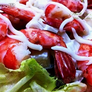 把土豆去皮切成小方块,加少许色拉酱拌匀,放在生菜做的碗中。把大虾去头去壳,放在土豆块上,找一张油纸裁成三角形,做个裱花袋,装入剩下的色拉酱,在大虾上裱出花网,就成了最老派的大虾色拉。(新派的就是随你创意发挥出来的样子,给你一个空间吧,估计会有“食神”的风范。)