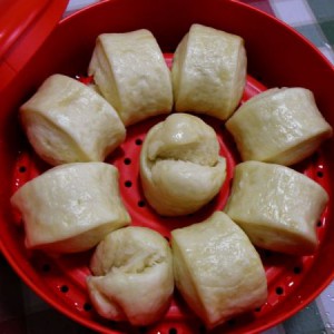 大约2个小时面团发成2倍大就可以取出,在菜板上搓成长条,用刀切成适当的小馒头,馒头上洒点水,最后醒一会面,上蒸笼蒸10分钟,等冷却两三分钟后取出即可。