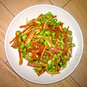 起锅热油,先炒胡萝卜丝,再下火腿丝,再下杏鲍菇丝,放点盐,菇能出水,最后下毛豆,撒点胡椒粉、鲜酱油,翻炒片刻,放点蚝油翻炒一下,出锅前撒点葱。