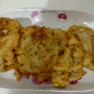 把配菜到进土豆泥的碗里,加一个鸡蛋,开始到面粉,一点一点的加,成糊状就给盐和黑胡椒调味,
