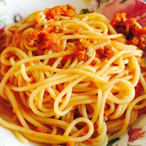 煮的西红柿肉酱黏黏的,关火,等意大利面煮好后盛到盘子里,浇上西红柿肉酱,开吃