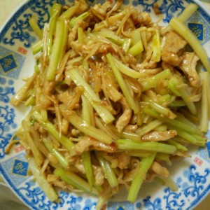 瘦肉切丝,加一匙地瓜粉,少许盐拌匀待用,西芹洗净先切成等长的段,再切成细条,金针菇切去老根,洗净切成跟西芹一样的长度