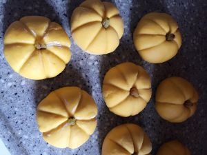 搓成圆用不锈钢勺柄压出条杠,用葡萄干当蒂头。勺子和葡萄干没有就找其他替代品,就地取材嘛。